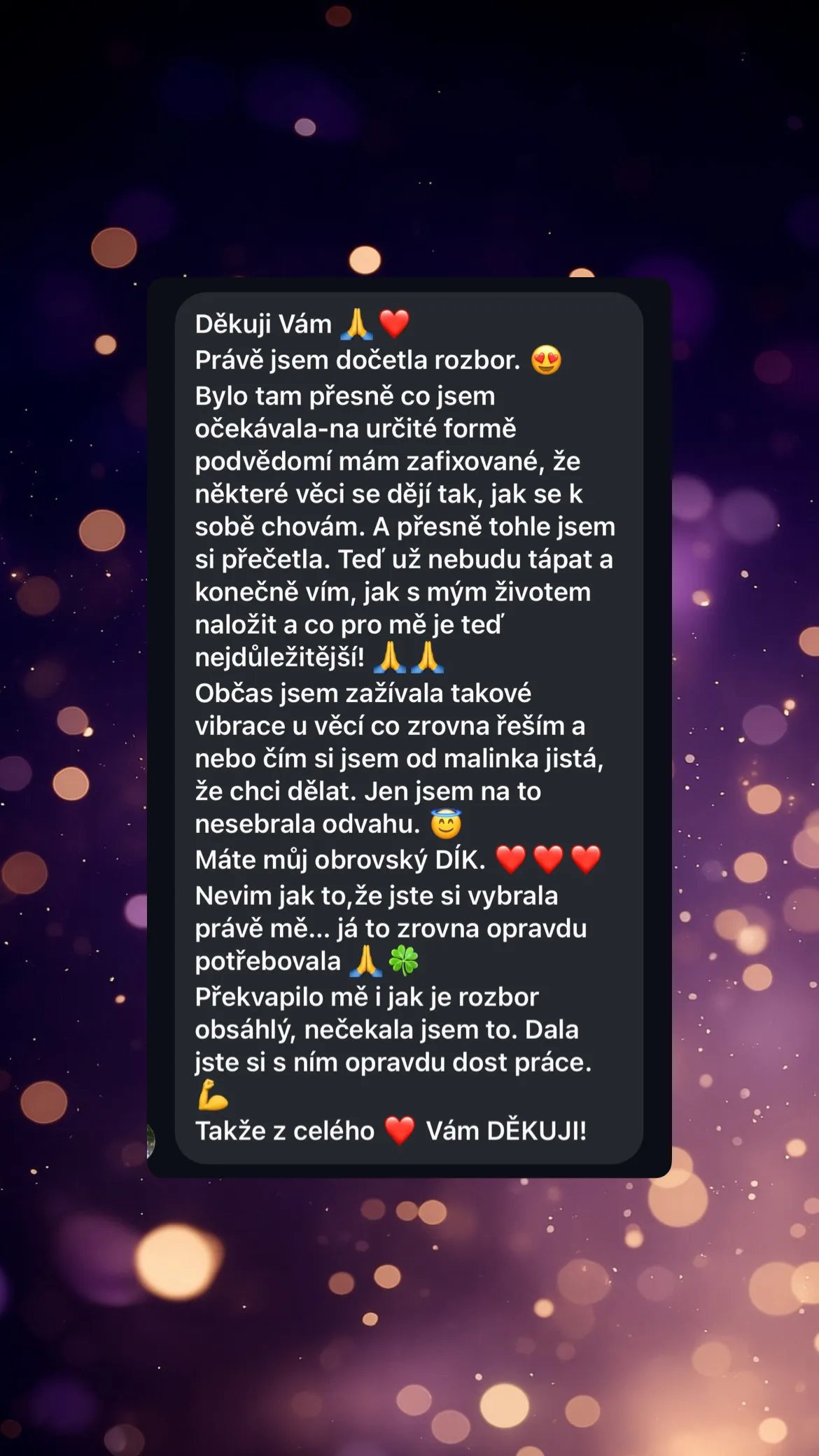„Premium rozbor vám pomůže nejen pochopit sebe, ale i začít žít život, ve kterém se cítíte naplněně – ve vztazích, ve financích i v seberealizaci.“