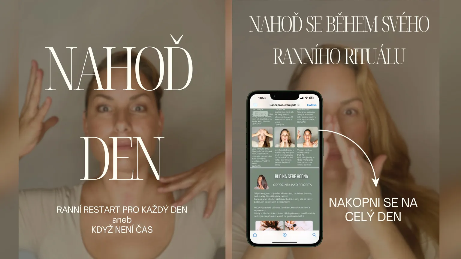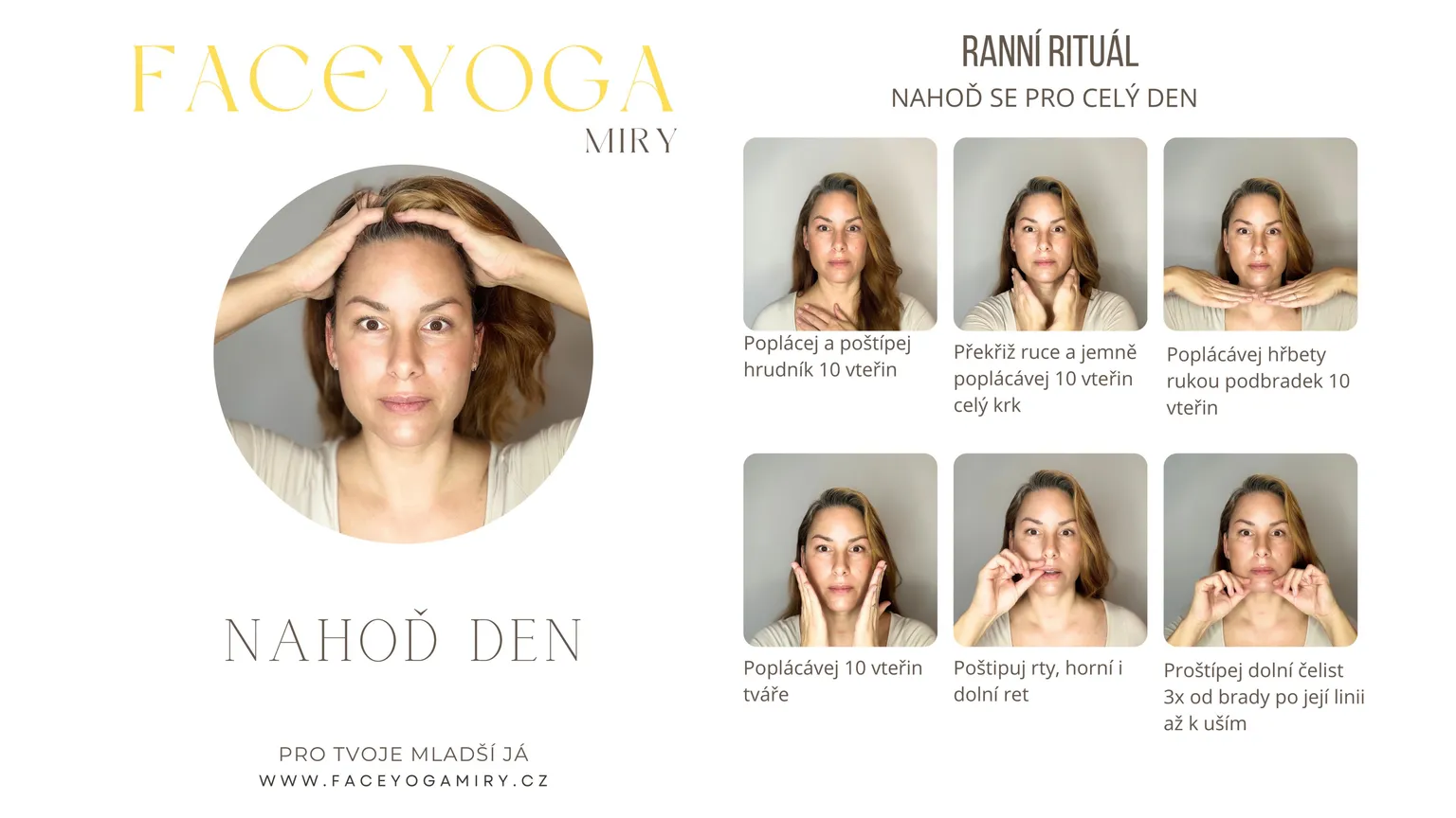 Můj e-book NAHOĎ DEN je rychlý set cviků, který ti pomůže probudit obličej i mysl během pár minut.
