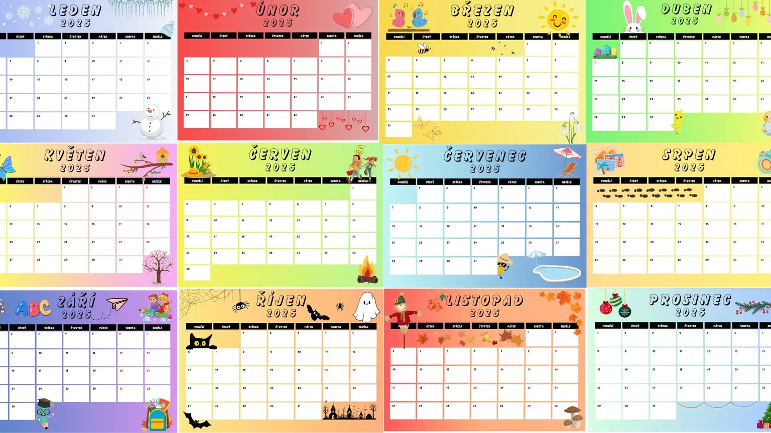Dvanáctistránkový soubor měsíčního kalendáře na rok 2025 k vytištění ve formátu A4 nebo A3.