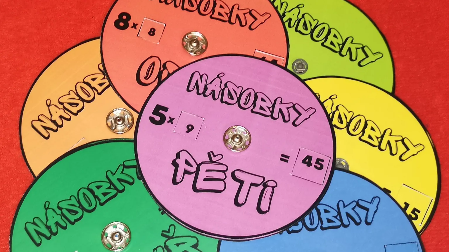 Čtyřstránkový PDF soubor pro trénink násobilky. Násobky jsou vždy barevně odlišeny, takže stačí soubor vytisknout (nejlépe na tvrdší papír), vystřihnout, vyřezat nebo vystřihnout okýnka, zkompletovat vždy dvě stejně barevná kolečka a spojit klasickými kovovými patentky na textil.