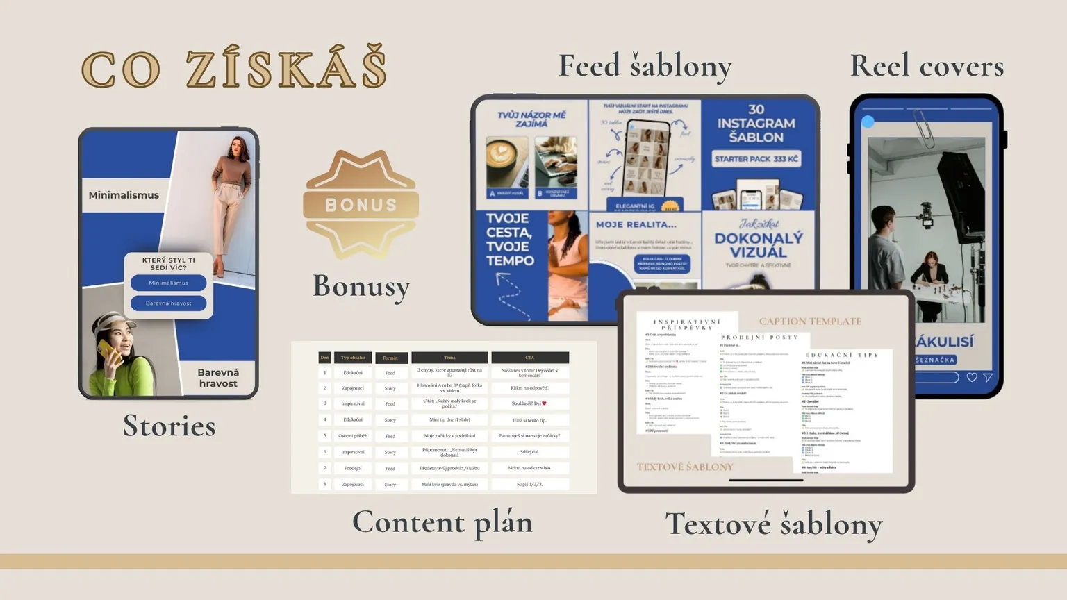 V tomhle balíčku najdeš všechno, co potřebuješ, abys mohla na Instagramu působit sebevědomě, profesionálně a zároveň ušetřila hodiny času.